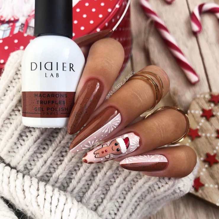 Dopo aver polimerizzato la base dovremo successivamente applicare un top opacizzante affinché le decorazioni possano risaltare sulla base creata. Poniamo qualche secondo in lampada se la possediamo oppure facciamo asciugare a testa in giù tutte le unghie per poi passare alla fase più divertente. Con un gel color o un semipermanente bianco, aiutandoci con un pennellino finissimo iniziamo a creare le decorazioni scelte, Makolina95 ad esempio ha realizzato i classici candy Canes, i fiocchi del pacco regalo e l’albero di Natale, tuttavia voi potreste sbizzarrirvi con la fantasia realizzando delle campanelle, delle stelle brillanti oppure delle palline di Natale, magari creando l’effetto scintillante con polvere di glitter.
